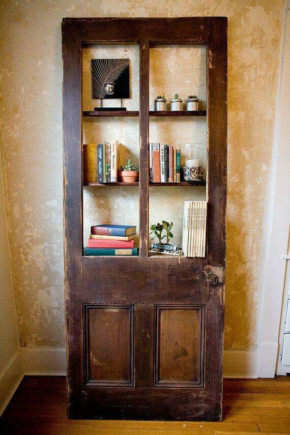To complete a rustically-styled living room, an old door can be converted into a bookcase for near-zero cost.
